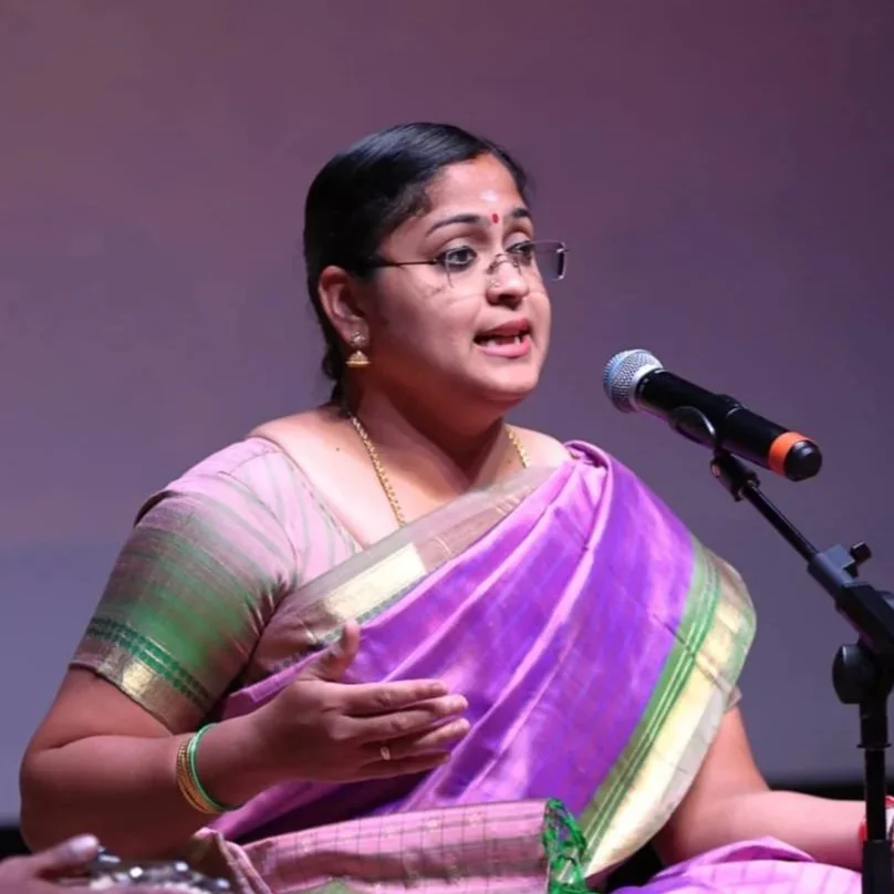 Lalitha Chithra Ravindran grew up in a family that stewards the Bhajana Sampradāya tradition. She began vocal training at six and won first prizes in the junior, senior, and super-senior categories at Narada Gana Sabha, Karur. Guided by her gurus, she cultivated a wide repertoire and strong manodharma; her first major solo was in 2008 at Sringeri Sri Sharada Mutt, Madurai. Now based in Charlotte, she is a full-time musician, practitioner, and teacher. She heads the Sri Saraswati School of Carnatic Music, teaching children and adults and presenting students in community concerts and annual recitals. Her thematic performances weave rāga ālāpana, kṛti and swara singing, and pallavi, featuring works by Tyāgarāja, Muthusvāmi Dīkṣitar, Swāti Tirunāl, and leading Tamil composers. She has performed for the Charlotte Swathi Thirunal Sangeetha Sabha and Charlotte Kala Kendra, and presented a 2025 lecture-demonstration on Nāda Yoga at Harvard Divinity School’s Program for the Evolution of Spirituality. She continues advanced training with Kalaimamani Dr. Prema Rangarajan.